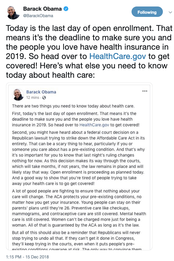 In an attempt of desperation to stay relevant, and hold on to what's left of his "legacy", barack hussein obama tweeted out a reminder that today is the last day for open enrollment in HIS signature piece of legislation, obamacare. You know the law that passed literally in the middle of the night Christmas Eve 2009, the last time Nancy Pelosi was Speaker of the House! Included in the tweet was a longer message addressing the "Affordable" Care Act's future, following TX US District Judge Reed O’Connor's ruling it is unconstitutional, reassuring his minions the law is still in effect where it will take months even years battling out the ruling.
