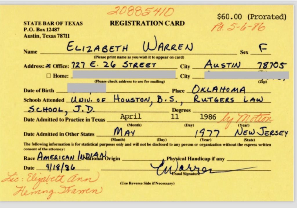 Sen Elizabeth Warren is having a bad day today after her Texas State Bar registration card surfaced showing she identified as "American Indian".